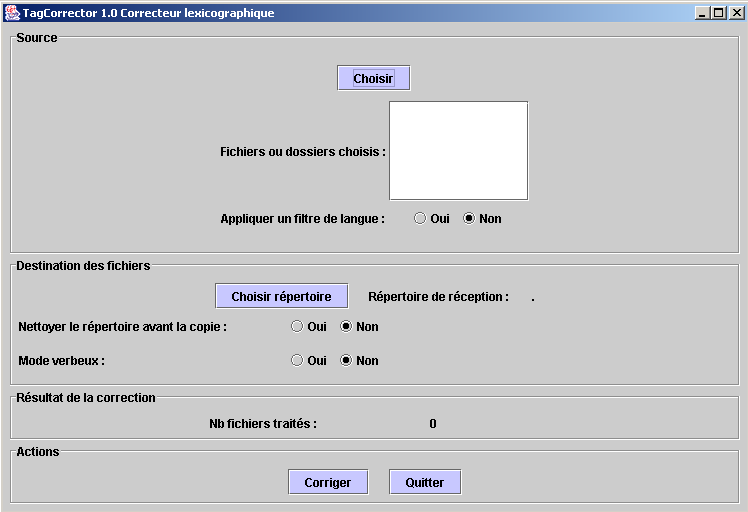 Dans son état actuel, TagCorrector se fonde exclusivement sur des critères lexicographiques, en d'autres termes, il ne corrige ni les fautes de grammaire, ni les fautes de style. Les corrections réalisées sont issues d'une étude linguistique sur les fautes réellement commises par des auteurs francophones. Lorsqu'une erreur est détectée, la correction est appliquée dans le fichier de sortie. Il est possible de connaître les opérations effectuées en choisissant l'option : "modeVerbeux". TagCorrector opère selon deux modes qui offrent les mêmes fonctionnalités :