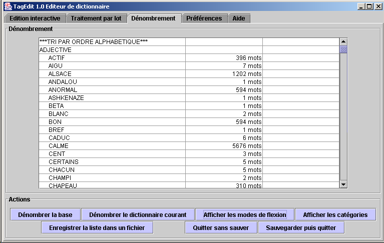 Ecran de dénombrement [haut du document] Il s'agit de synthétiser le contenu d'un ou plusieurs dictionnaires afin d'en avoir une idée quantifiée. L'écran ne permet aucune modification. Il est possible d'enregistrer les tableaux de dénombrement dans des fichiers, par exemple pour les inclure dans un rapport.