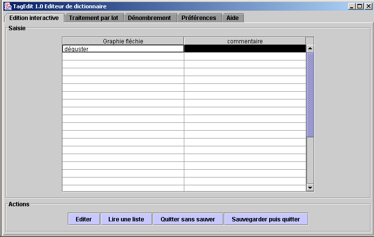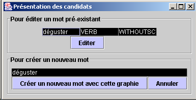Les cellules de la colonne de gauche sont destinées à recevoir les graphies des mots. Ces dernières sont ou bien saisies au clavier (pour un usage réellement interactif) ou bien chargées depuis un fichier. Dans ce dernier cas, les graphies viennent d'un traitement par lot effectué par le lexicographe ou bien une autre personne qui lui a préparé le travail. La colonne de droite permet de saisir un commentaire de gestion relatif à la description du mot, ce sera par exemple: "fait" ou "à vérifier". Que la graphie soit saisie au clavier ou bien chargée depuis un fichier n'a aucune incidence sur le reste de la session TagEdit. Quand on clique sur "Editer" la graphie est recherchée dans le dictionnaire. Selon les préférences choisies (voir écran idoine) la recherche s'effectue en considérant que la chaîne de caractères est une forme lemmatisée, une forme fléchie (avec le déclenchement d'un analyseur morphologique intégré à la station) ou encore un identifiant d'objet. L'écran qui s'affiche alors présente les candidats issus de la recherche :