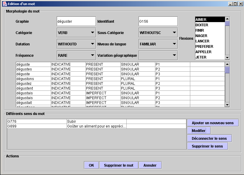 La partie haute est présente quand un candidat est trouvé, cela permet la modification des mots existants. La partie basse est toujours présente, même si des candidats sont trouvés, cela permet d'ajouter les mots nouveaux. En supposant, que l'on choisise l'édition d'un mot existant, l'écran suivant va être présenté. C'est l'écran de la saisie de la morphologie du mot et de la liaison vers les sens du mot.