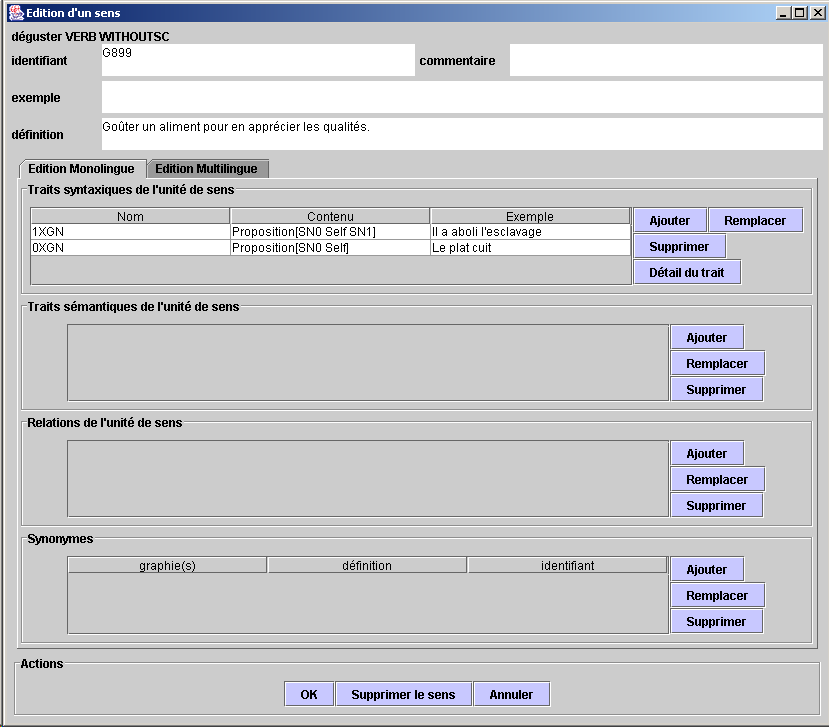 En supposant que l'on désire modifier le sens d'un mot, il faut le sélectionner et cliquer sur "Modifier". L'écran suivant va alors être présenté. C'est l'écran de la saisie d'un sens.