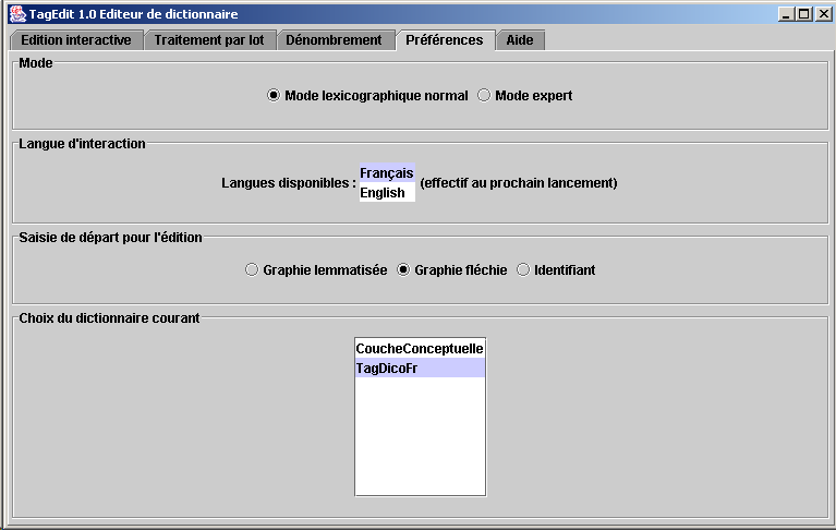 Ecran des préférences [haut du document] Le mode lexicographique normal permet de décrire un mot, ses sens et ses traductions : c'est tout. Le mode expert permet de consulter et modifier des informations cachées ou reconstituées dans le mode normal. Par exemple, dans le mode expert, il est possible de consulter les attributs d'administration du mot: "quand a-t il été modifié la dernière fois et par qui ?". De plus, il est possible d'éditer les constantes linguistiques de la langue comme les modes de flexion ou les propriétés syntaxiques. L'écran de saisie des préférences se présente de la manière suivante: